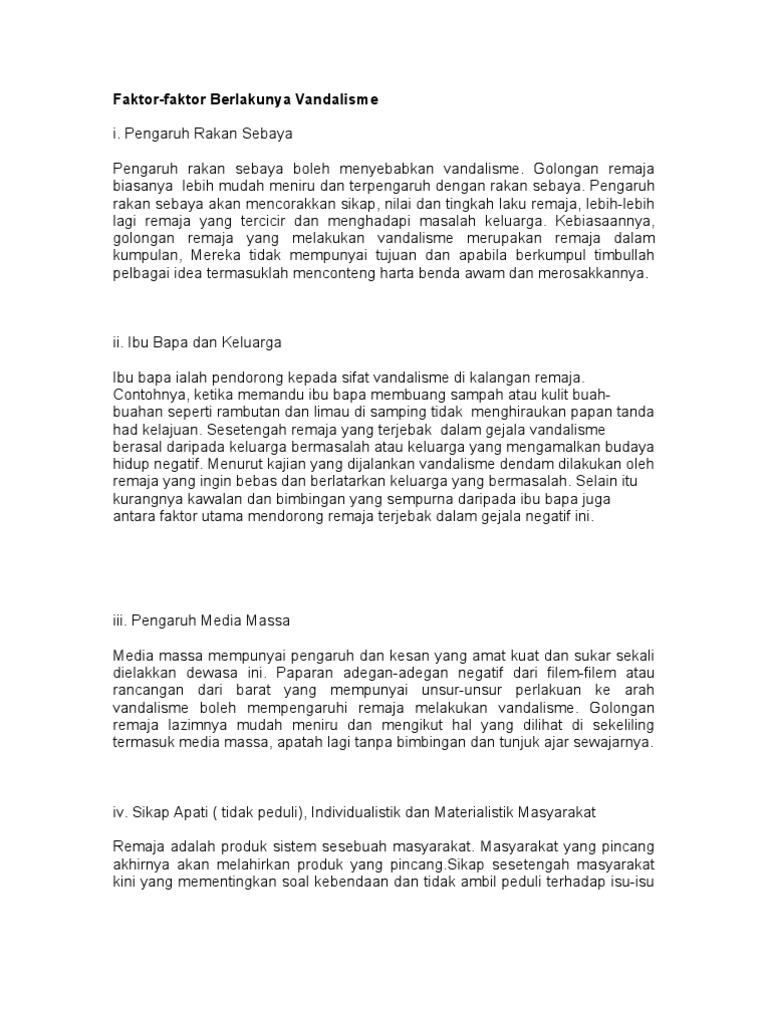 Perkataan vandalisme berasal daripada nama sebuah puak di Eropah iaitu vandals yang telah membinasakan kota Rom pada tahun 445 Masihi. Pada dasarnya media massa memainkan peranan yang besar di dalam masyarakat kerana ia dapat menghubung serta mencapai khalayak yang besar melangkaui sempadan geografi Folkerts Lacy. PENGARUH MEDIA MASSA TERHADAP PEGANGAN NILAI AKHLAK REMAJA.