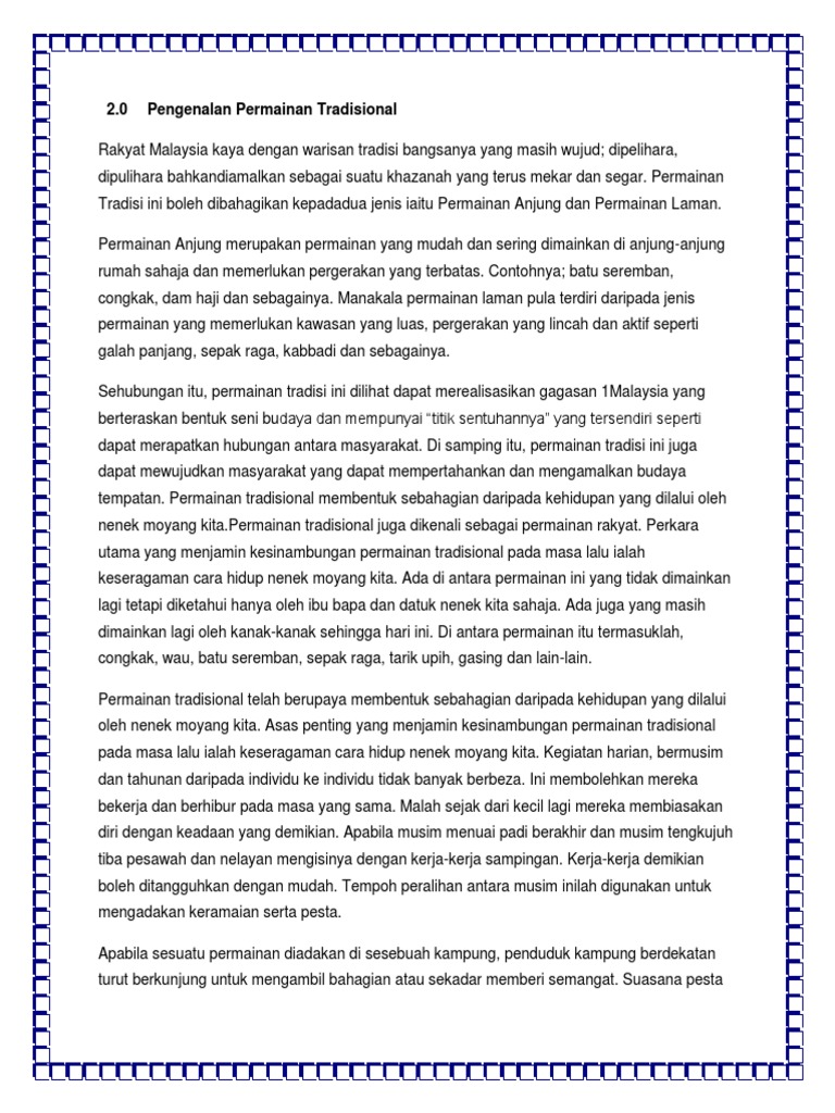 Disamping itu usaha yang dapat dilakukan adalah peranan pihak Kementerian Kesenian Kebudayaan dan Warisan agar. 2020-06-18 Permainan tradisional manfaatnya begitu lengkap. DI era 1970-1990-an anak-anak belum mengenal permainan modern seperti Playstation online game internet dan komputer.