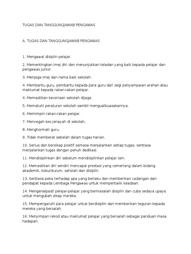 Membantu guru pembantu kepada para guru dari segi penyampaian arahan atau maklumat kepada rakan-rakan pelajar. 10032014 Jawatan adalah amanah kerajaan yang perlu dipikul oleh penjawat awam.